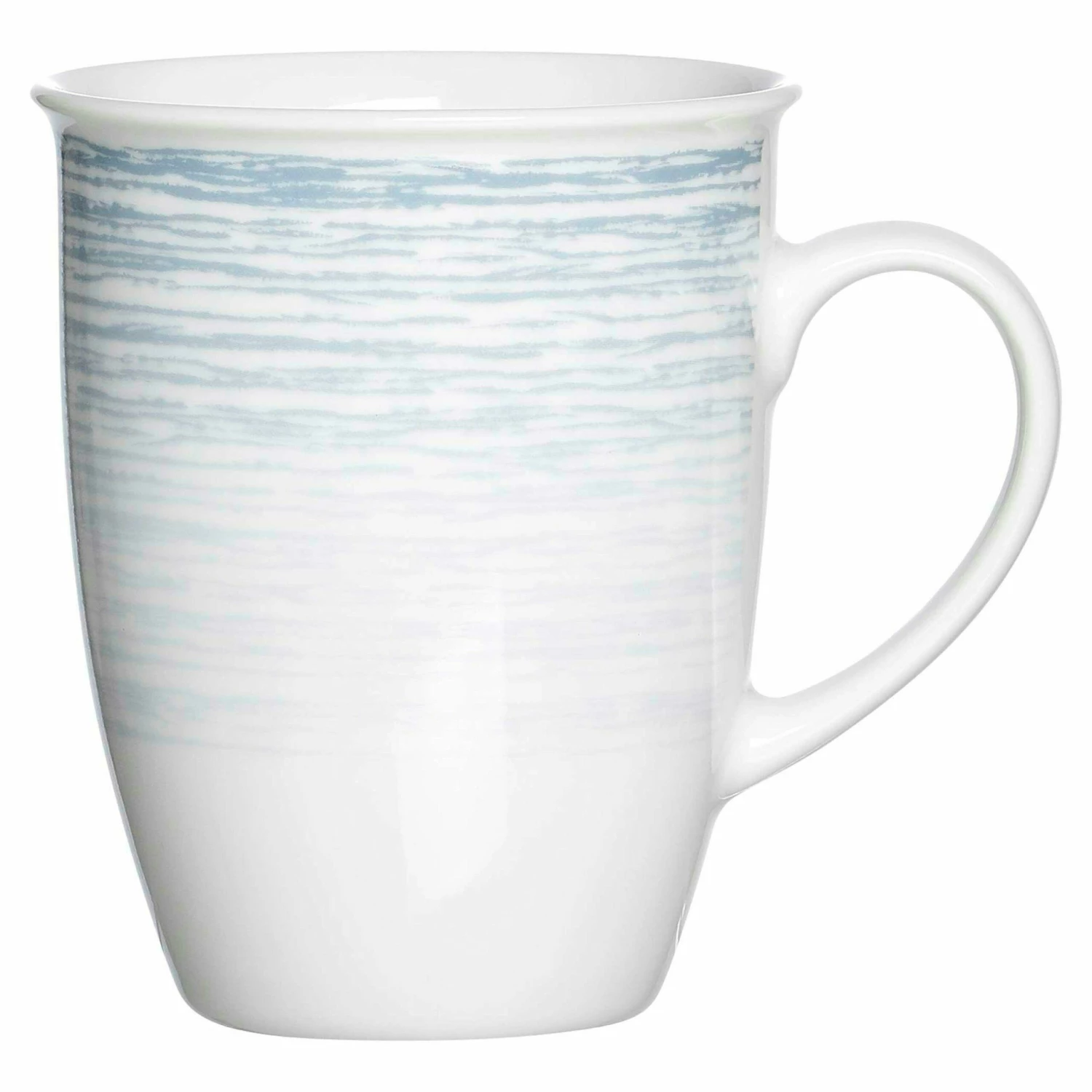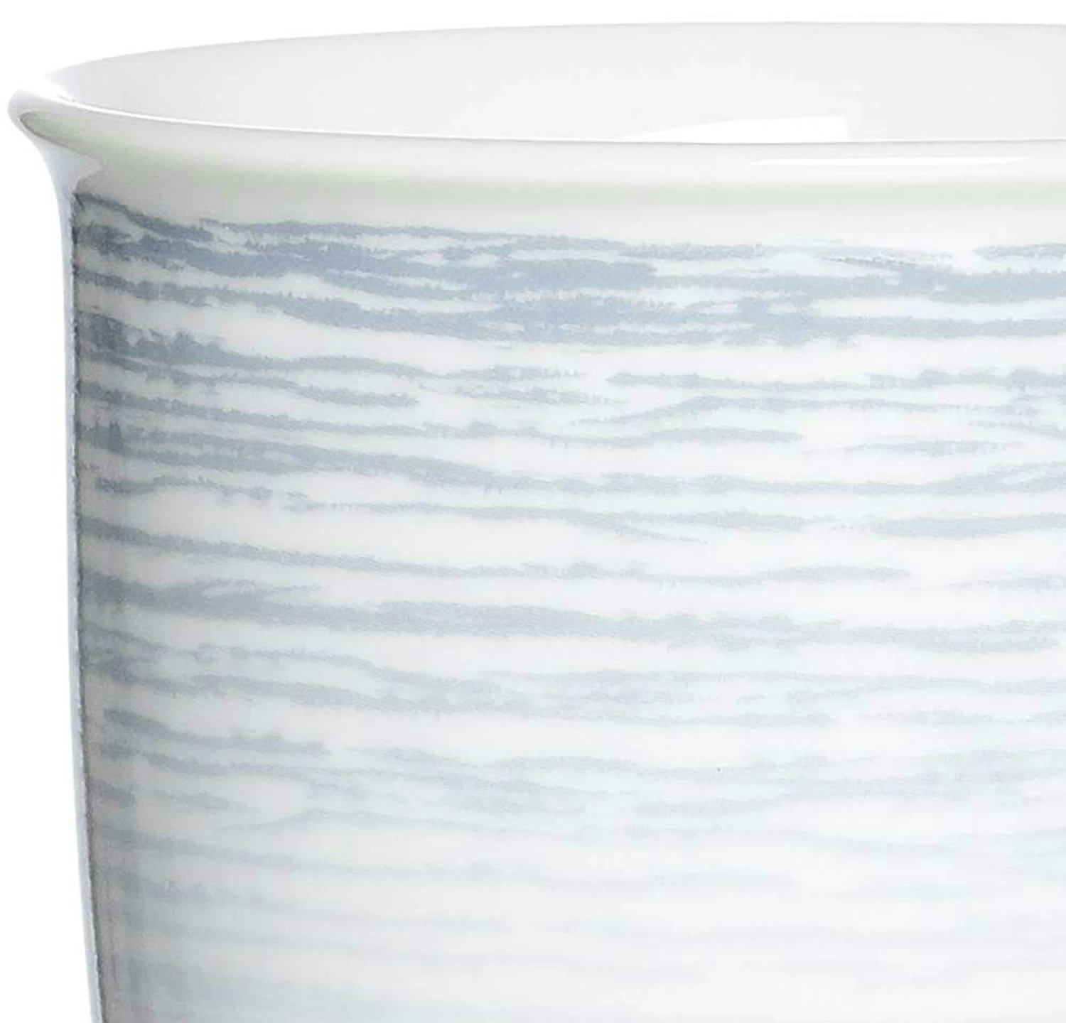 - Auf jedem Becher sind außen unterschiedlich breite und kräftige blaue Linien zu sehen, die zum Boden hin heller werden und so ans Meer erinnern, während die Innenseite und der Henkel schlicht in Weiß gehalten sind