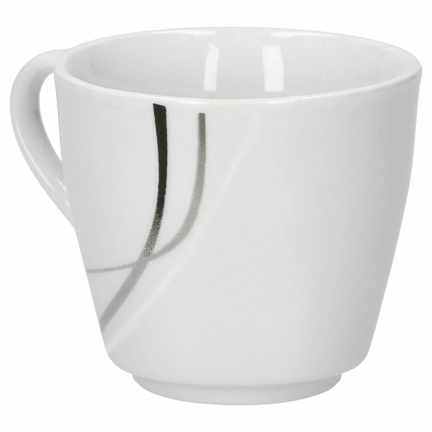 Hochwertiges Espressotassen-Set der Serie Silver Night aus dem Hause Van Well. Die 2-tlg. Kombination ist die ideale Grundausstattung für den Verzehr frisch aufgebrühter Kaffeebohnen. Bis zu 110 ml fasst die kleine Tasse im abstrakten Look. Schwungvolle Linien im Schwarz-Grau-Verlauf zieren die edle Silver Night-Kollektion. Der silberne Streifen setzt zusätzlich stilvolle Highlights.