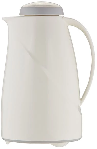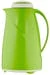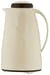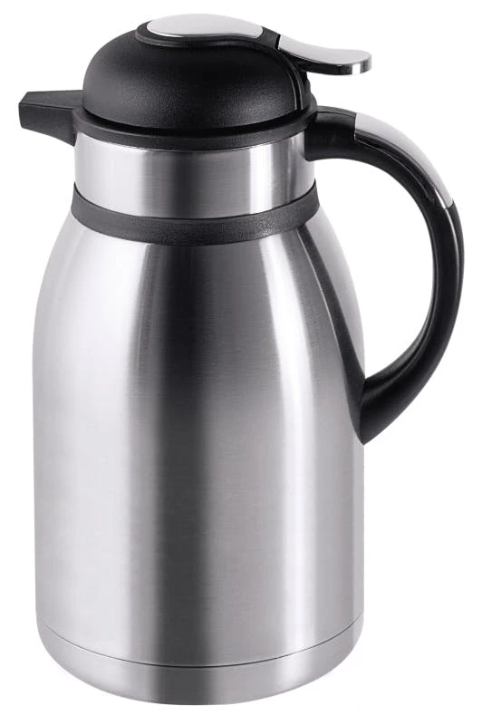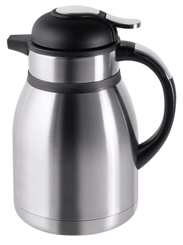 Isolierkanne, innen und außen aus Edelstahl, matt poliert, mit schwarzem Griff und Verschluss, Daumendruck-Mechanismus ermöglicht das Ausgießen ohne Öffnen des Deckels