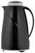 Isolierkanne, innen und außen aus Edelstahl, matt poliert, mit schwarzem Griff und Verschluss, Daumendruck-Mechanismus ermöglicht das Ausgießen ohne Öffnen des Deckels