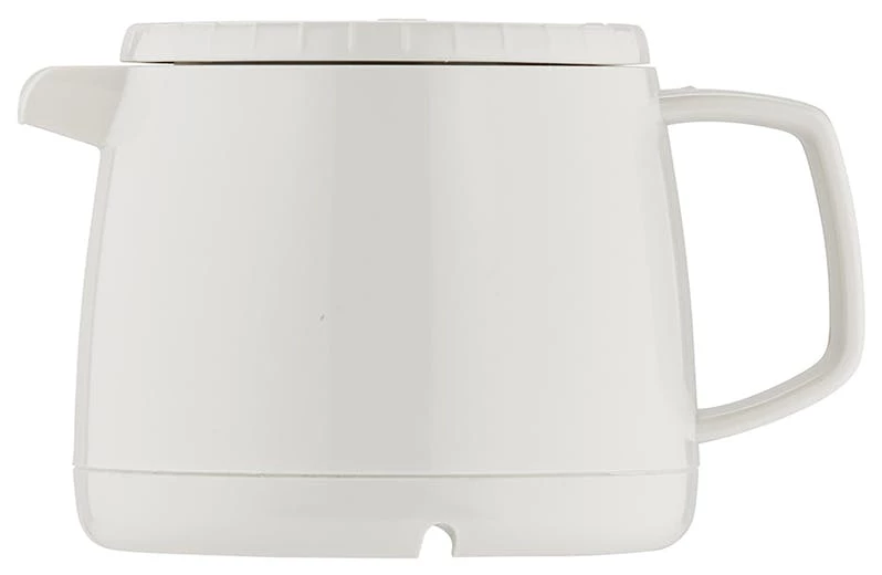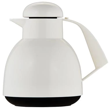 Isolierkanne, innen und außen aus Edelstahl, seidenmatt poliert, verchromter Griff, mit schwarzem Deckel, großer Daumendruck-Mechanismus ermöglicht das Ausgießen ohne Öffnen des Deckels, große Öffnung zum Einsetzen unter Kaffeeautomaten