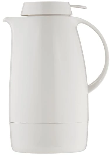 Isolierkanne, innen und außen aus Edelstahl, matt poliert, mit schwarzem Griff und Verschluss, Daumendruck-Mechanismus ermöglicht das Ausgießen ohne Öffnen des Deckels