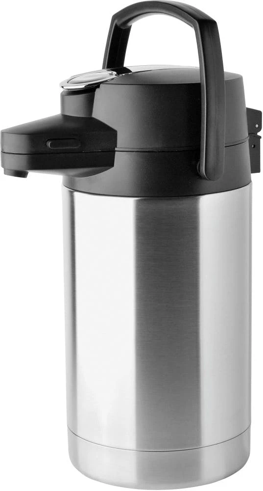 Isolierkanne GLACE, Inhalt 1,5 Liter, aus doppelwandigem Edelstahl, schwarz lackiertmit glänzender Oberfläche und praktischer Einhandbedienung. Höhe: 24,3 cm, Durchmesser: 13,5 cm, Handspülung empfohlen. Im Geschenkkarton.