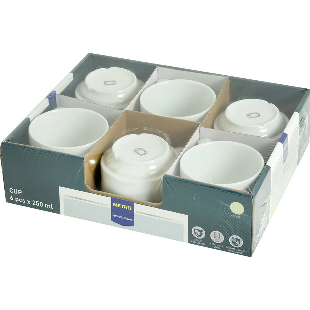 Das Kaffee Tassen Set Caterer von METRO Professional besteht aus 6 Tassen. Jede Tasse hat ein Fassungsvermögen von 250ml und ist aus Porzellan gefertigt. Die Tassen sind stapelbar, besitzen eine hohe Stoßfestigkeit und sind wärmeschockbeständig.